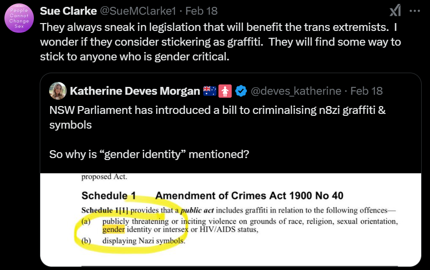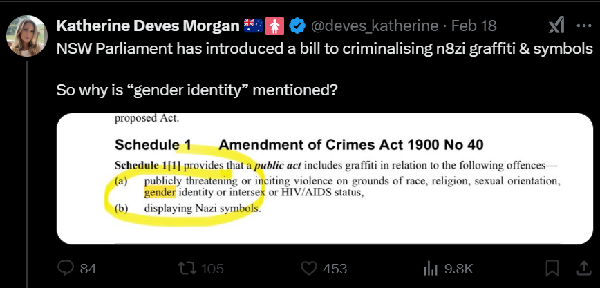 Anti-trans campaigners in New South Wales are raising the alarm on X that newly passed legislation—aimed at criminalising Nazi symbols—could limit their ability to publicly threaten trans people with violence. Under the amendments to the Crimes Act, inciting or threatening violence on the basis of “race, religion, sexual orientation, gender identity, or intersex or HIV/AIDS status” with graffiti would explicitly be considered a criminal offence.