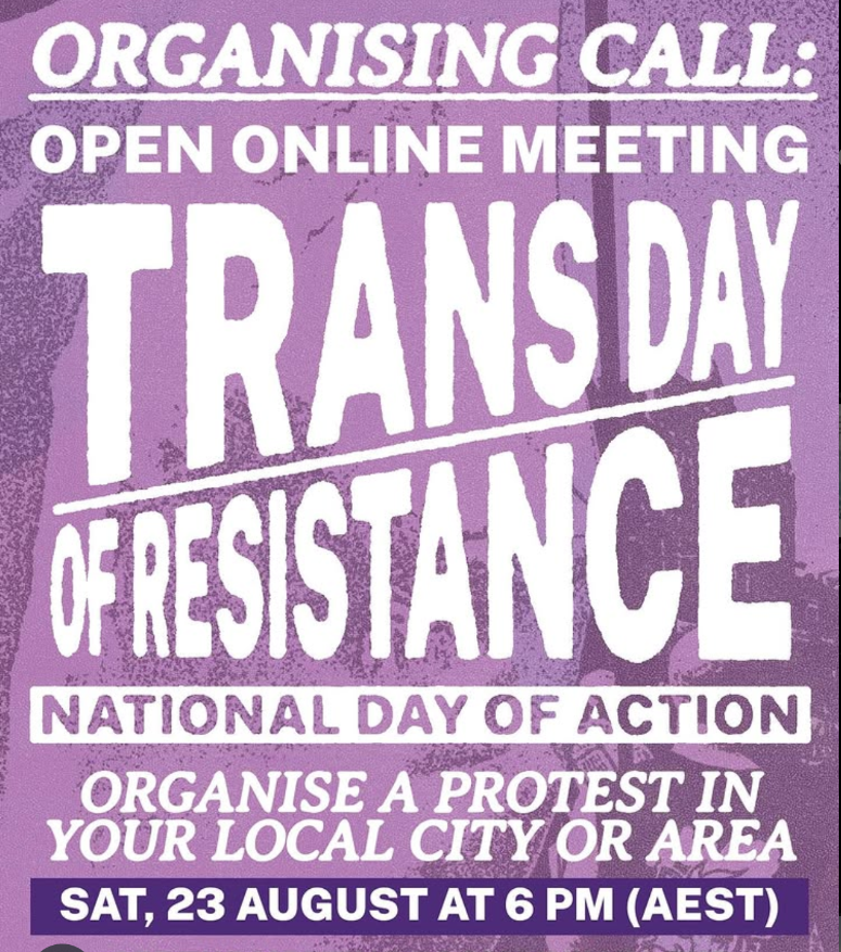 An open call for trans and gender diverse people interested in helping to organise a national ‘Trans Day of Resistance’ has been put out by the Trans Solidarity Network — a group of transgender activists and advocates across Australia. The Trans Day of Resistance is planned for the date or weekend closest to Trans Day of Remembrance, which takes place on the 20th of November this year.