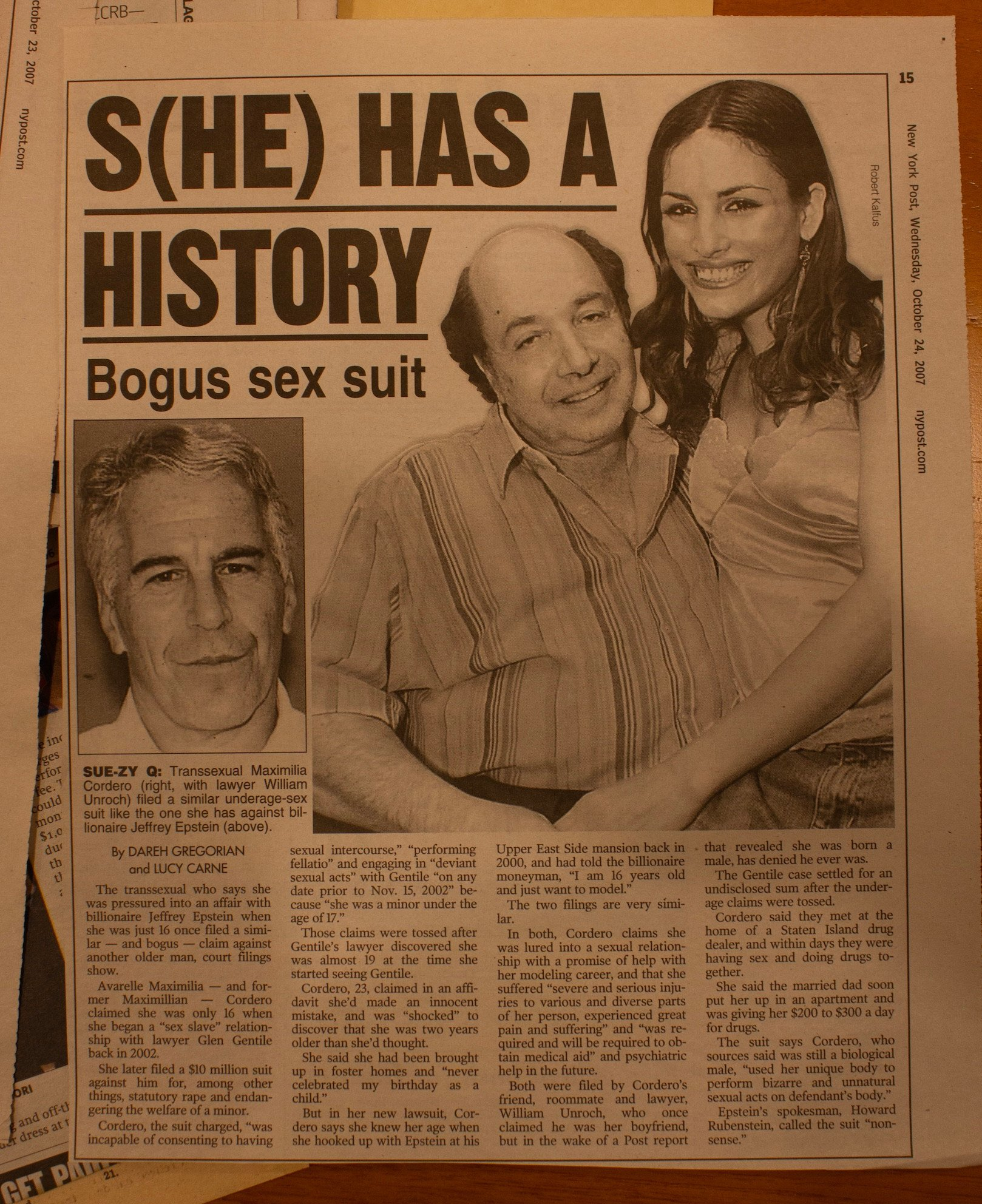 "GENDER-BEND SHOCKER: Kinky-sex suit gal is a man," New York Post, October 23, 2007