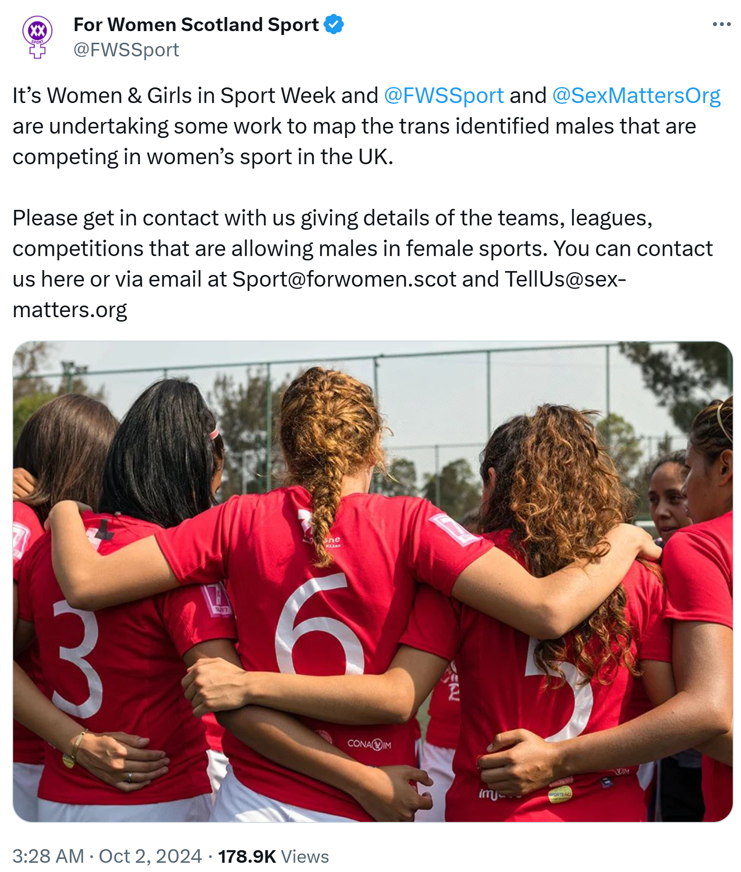 Amid backlash, For Women Scotland attempted to downplay the scope of their campaign, claiming they were only seeking information about teams and leagues that allow transgender women. However, their initial statement explicitly referred to 'mapping' transgender women competing in women’s sports, and the post below from Sex Matters additionally makes it clear it is about targeting specific women.